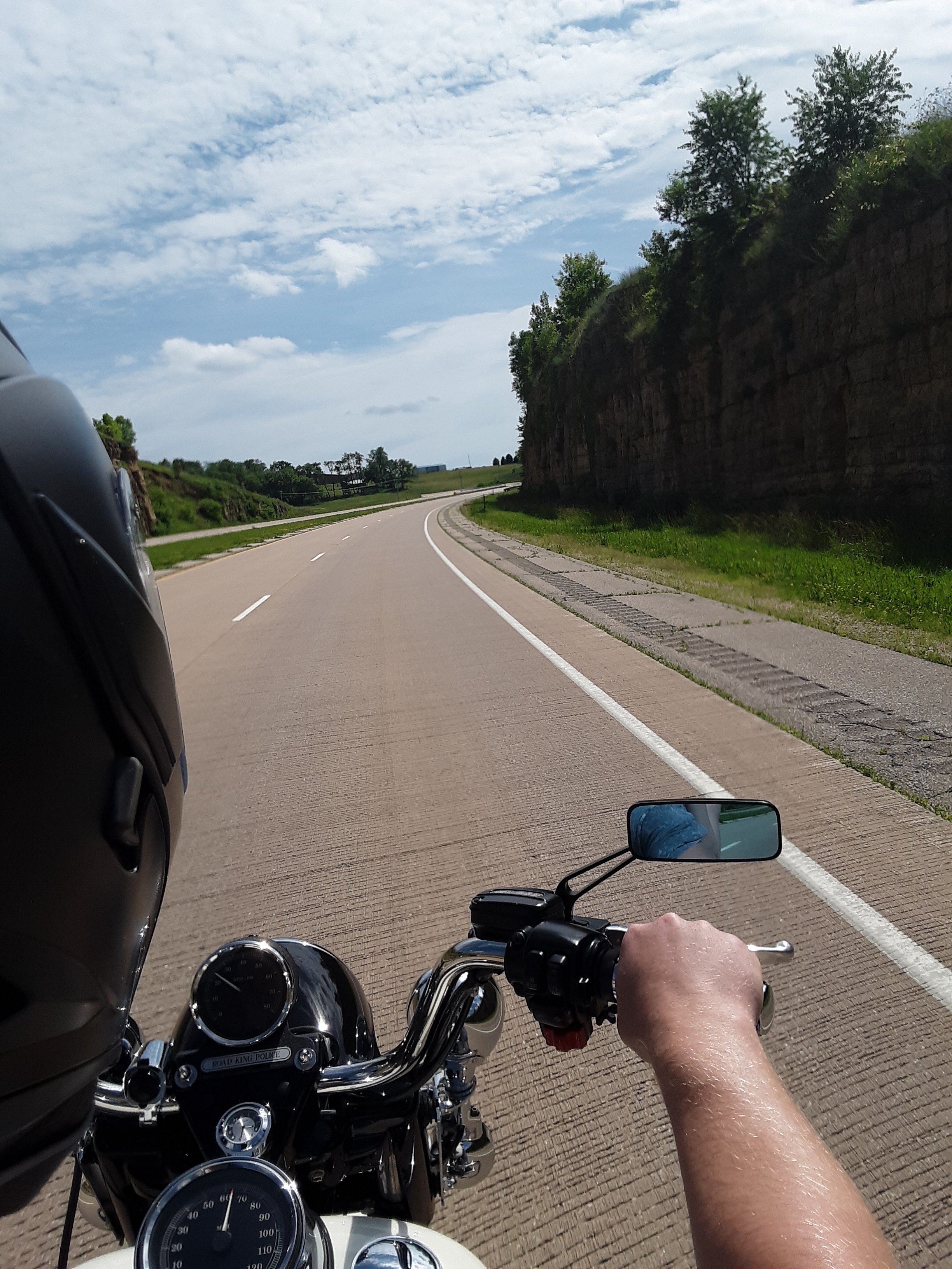 Sunday was a beautiful day. 90 and humid, which was perfect for long rides, we picked a city which intrigued us and took to the open road. The Wisconsin-Iowa Border is absolutely gorgeous. The roads appear to be cut through the earth, leaving sheer rock faces on either side. The countryside is rolling, grassy, or covered in green trees. There’s a feeling as if the land has never been touched.