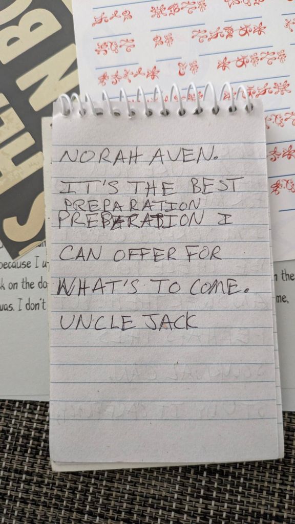 This Uncle Jack guy is a joke. He’s wasting his niece’s precious time, while her life is in danger, I might add, to write wordy little messages with absolutely no point to them.